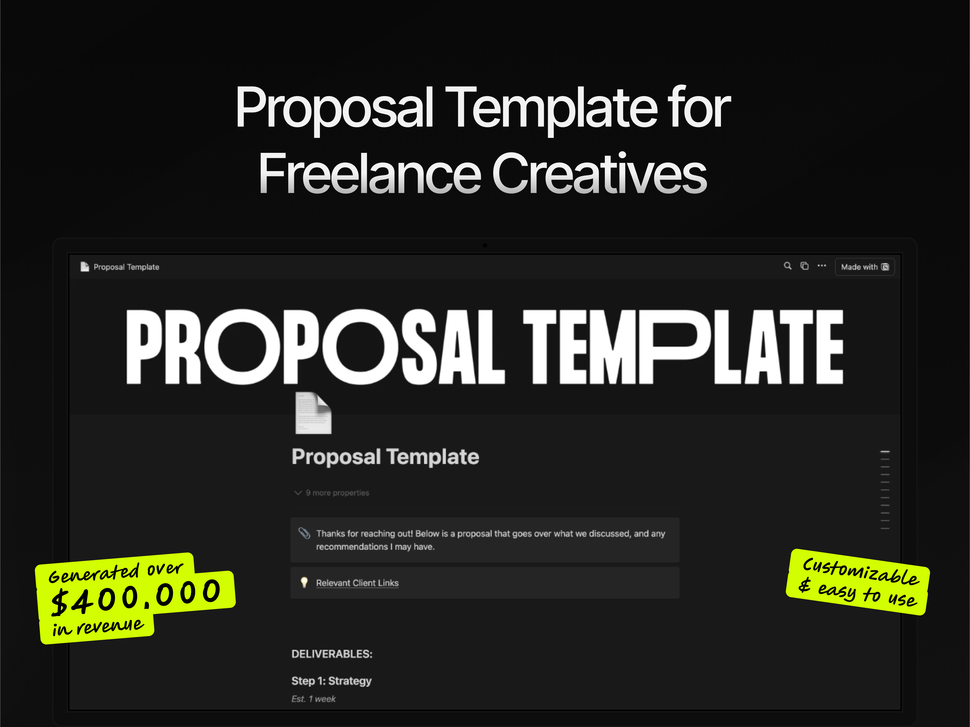 The Notion proposal template I've used to land over $400,000 in freelance design and strategy work.📄 Fully Customizable Notion Page: Easily editable for any project📂 Deliverables Library: Library of the most common design tasks with descriptions to plug and play to build any proposal. 💬 FAQs Template: Written after 5+ years of experience working as a freelancer, so you can avoid the mistakes and miscommunications I've had.